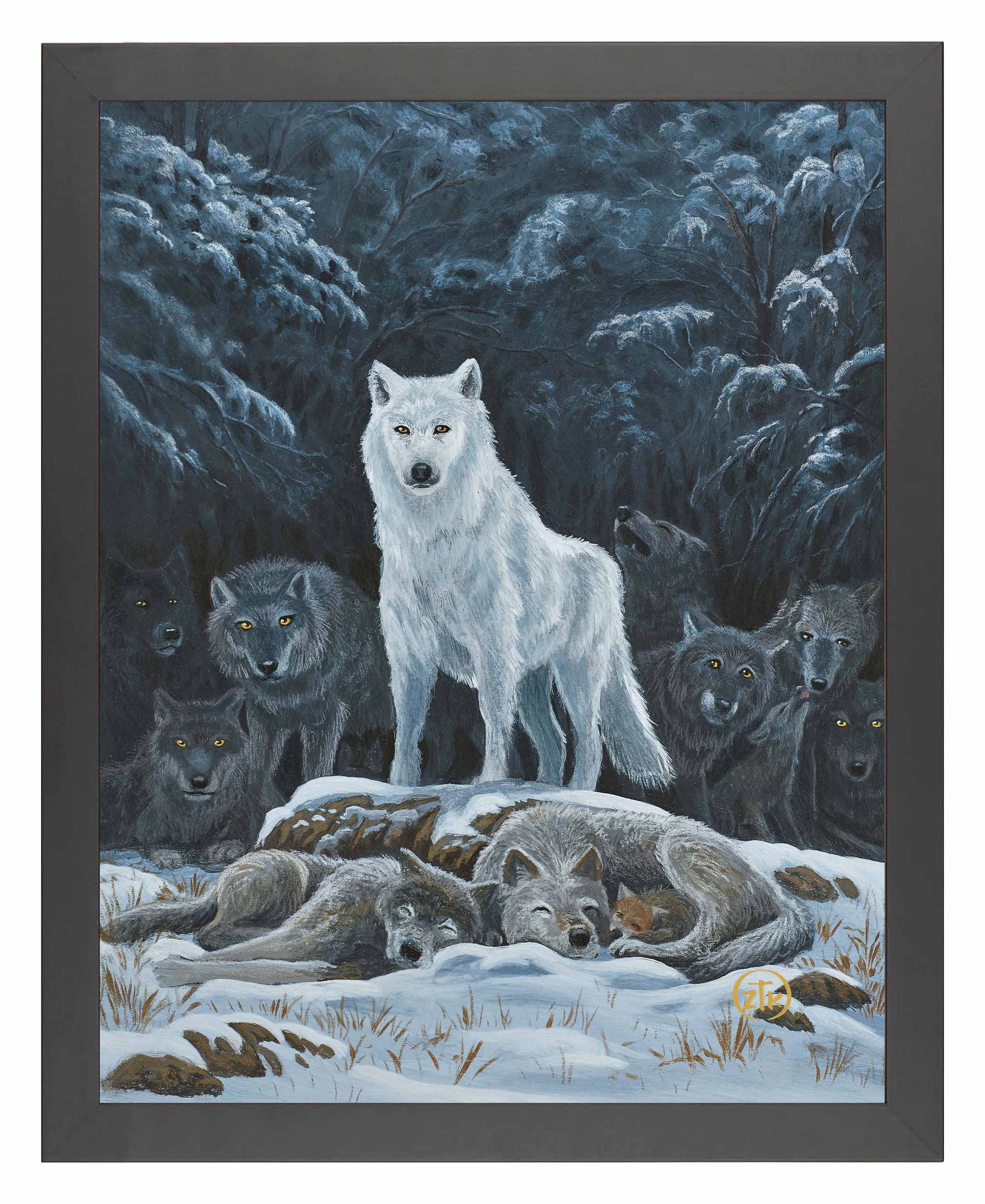 In many cultures, courage, loyalty, and a thirst for freedom are characteristics that define the nature of the wolf. In my latest Animal Accents painting, I try and capture these attributes as well as the physical majesty of these wild spirits as they rest in pack. In Winter Guard the evening cold and the coming dark create a silence over the snow shrouded landscape. The wolf pack leader peers into the dim assessing the view for signs of danger and intrusion. The howl of his fellow fills the air to provide warning of the huddled group to others of their kind. The territory is theirs to roam and hunt as the next day dawns. I hope you enjoy this homage to these magnificent animals, and, as always, thank you for sharing my adventures in art.