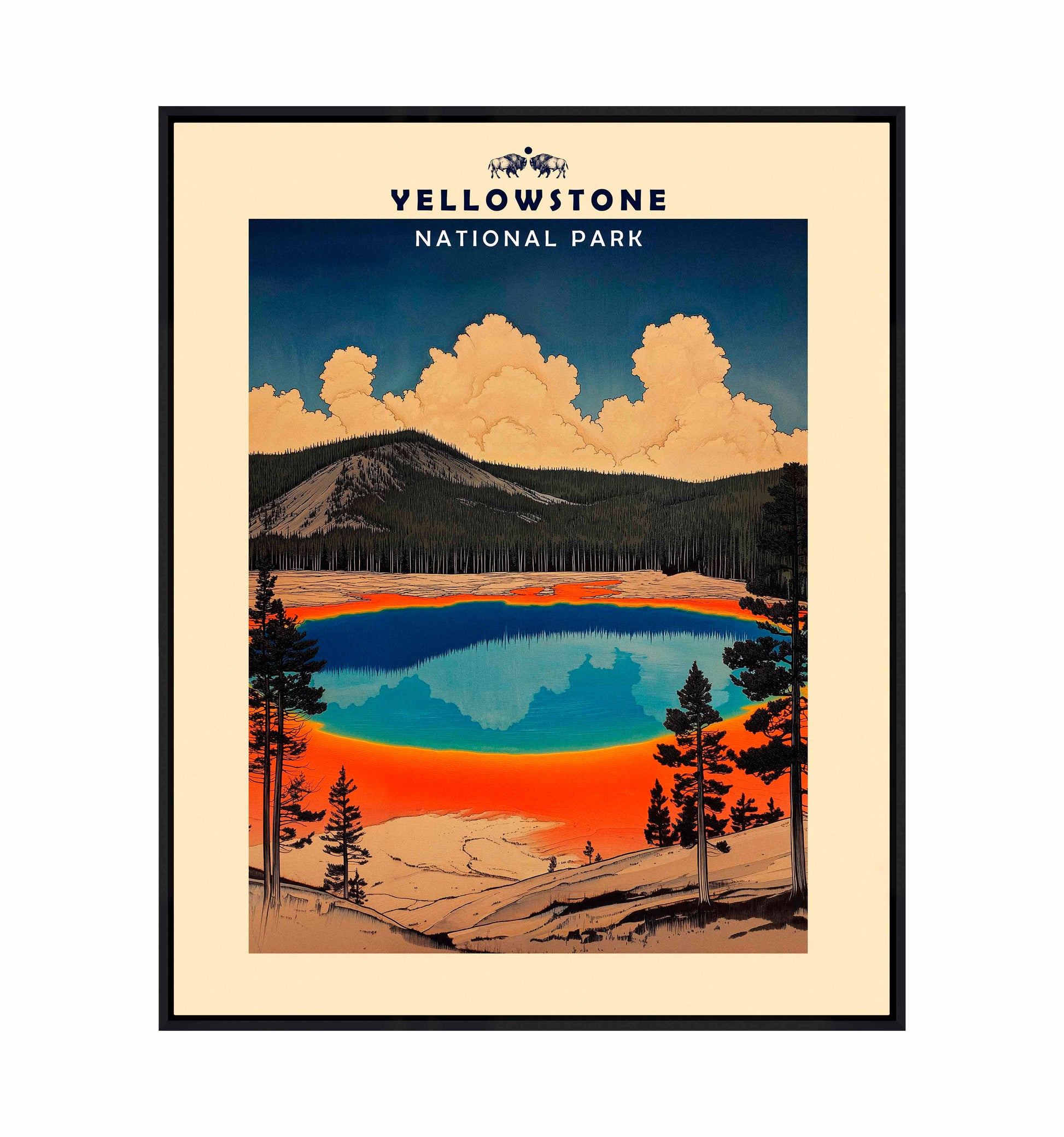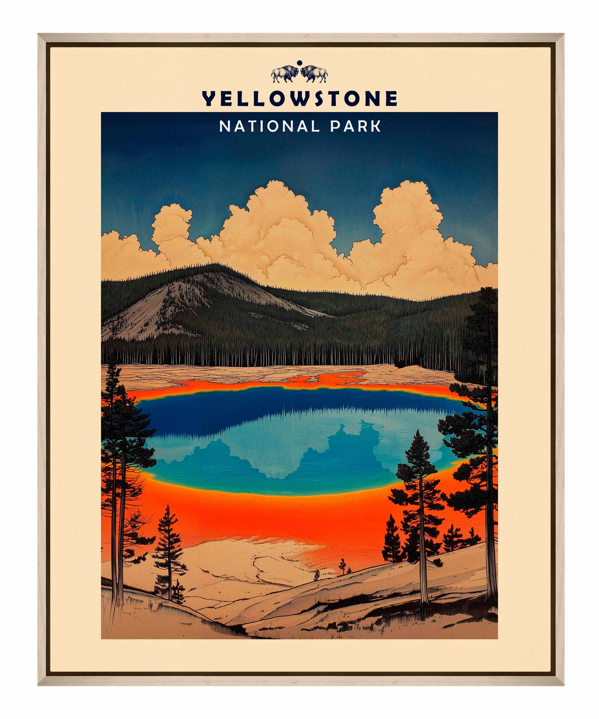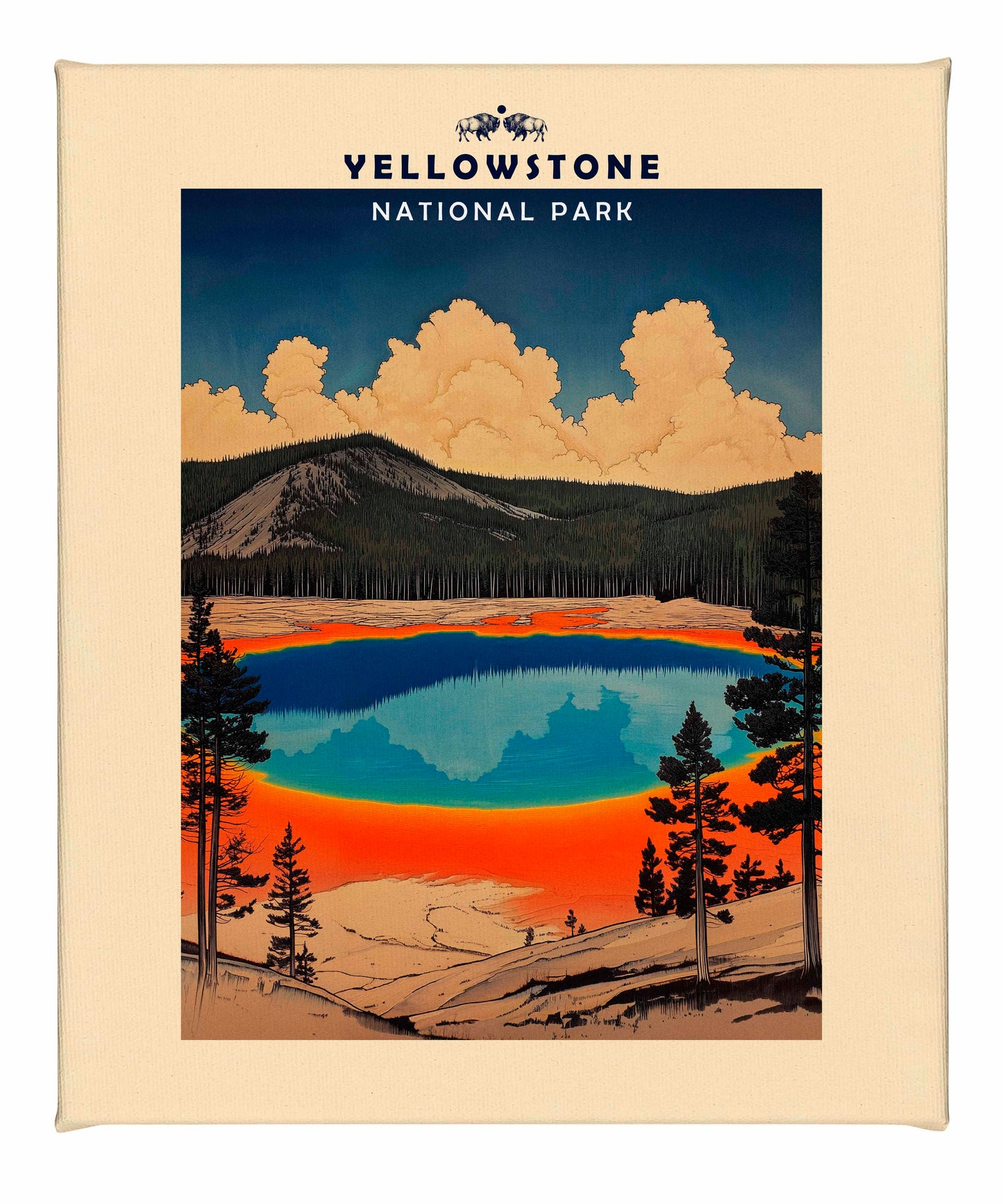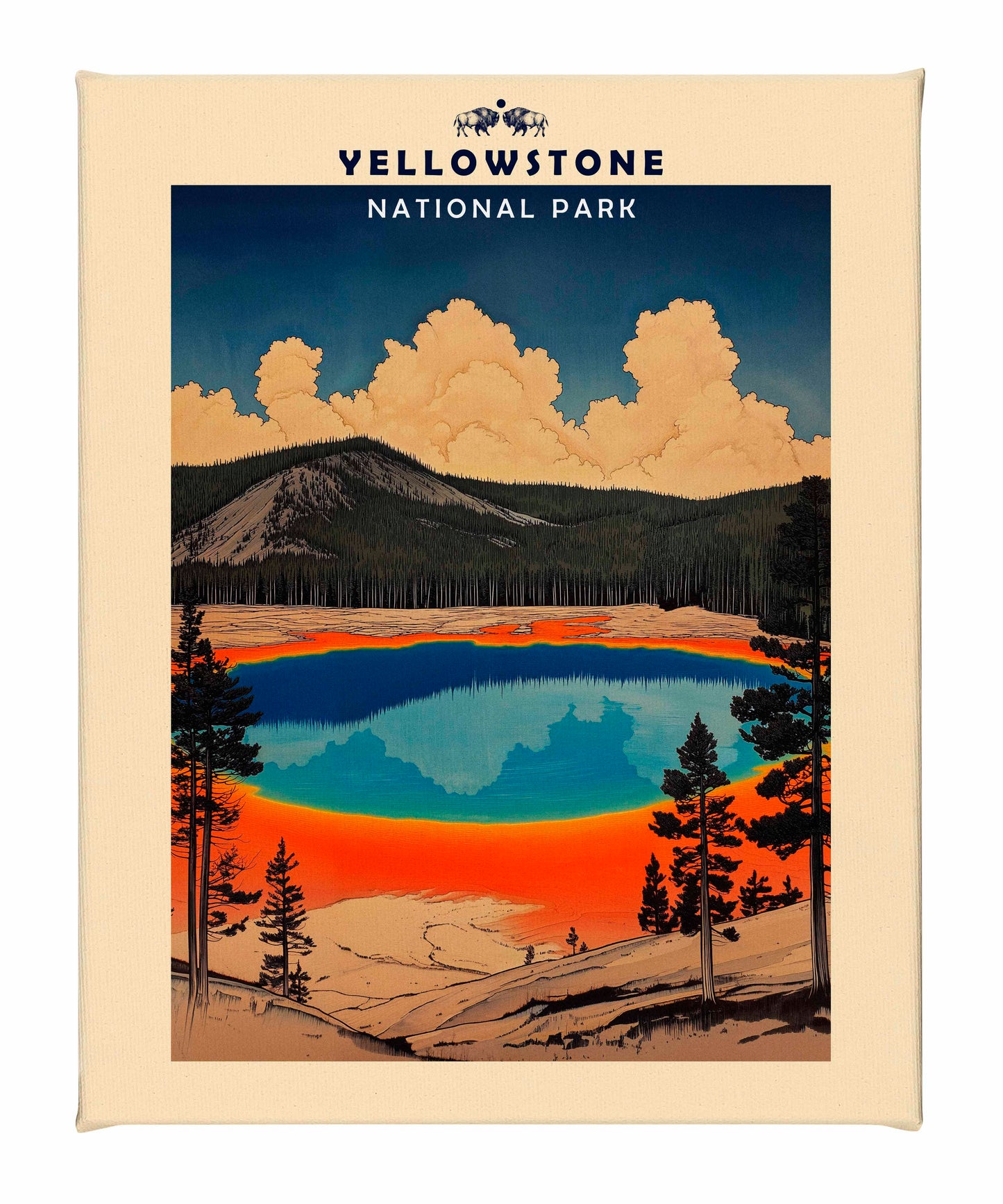 This vintage-style travel poster art depicts an iconic scene from Yellowstone National Park. The image showcases the vibrant, multicolored Grand Prismatic Spring, one of the park's most famous geothermal features. The spring's vivid blue center is surrounded by bands of orange, red, and yellow, accurately representing its real-life appearance. The composition is framed by silhouettes of pine trees, emphasizing the natural setting. Above the spring, billowing clouds dominate a deep blue sky, creating a dramatic backdrop. The mountainous terrain in the background adds depth to the scene. The artwork employs a limited color palette and simplified shapes, characteristic of mid-20th century travel poster aesthetics.