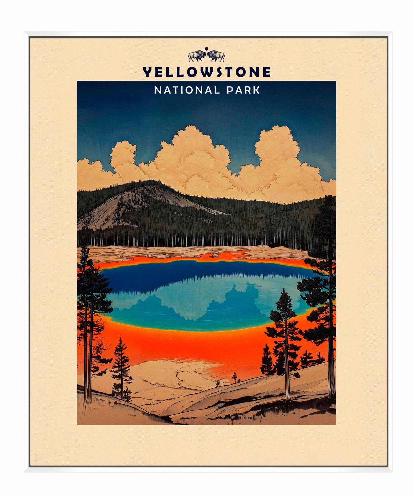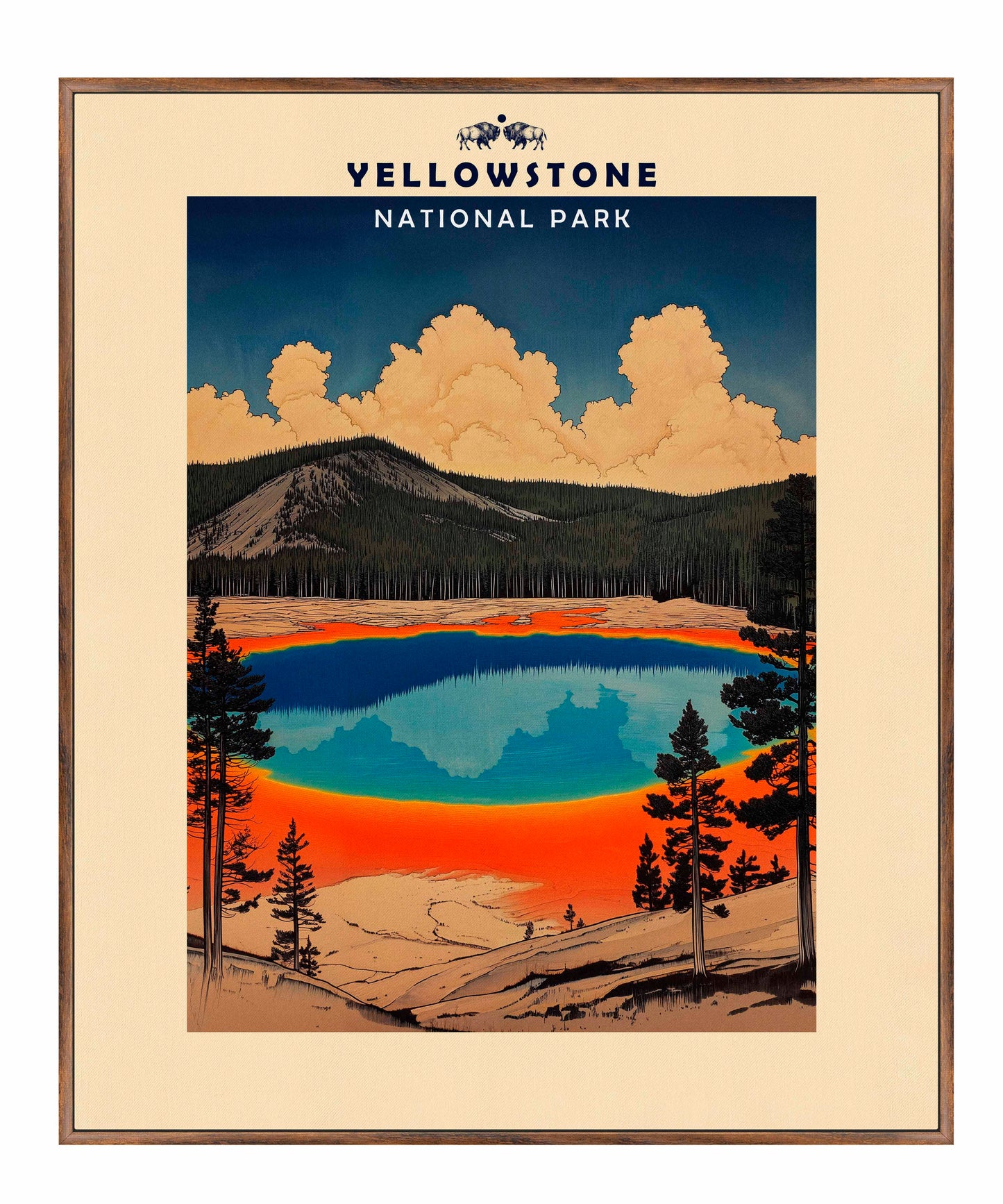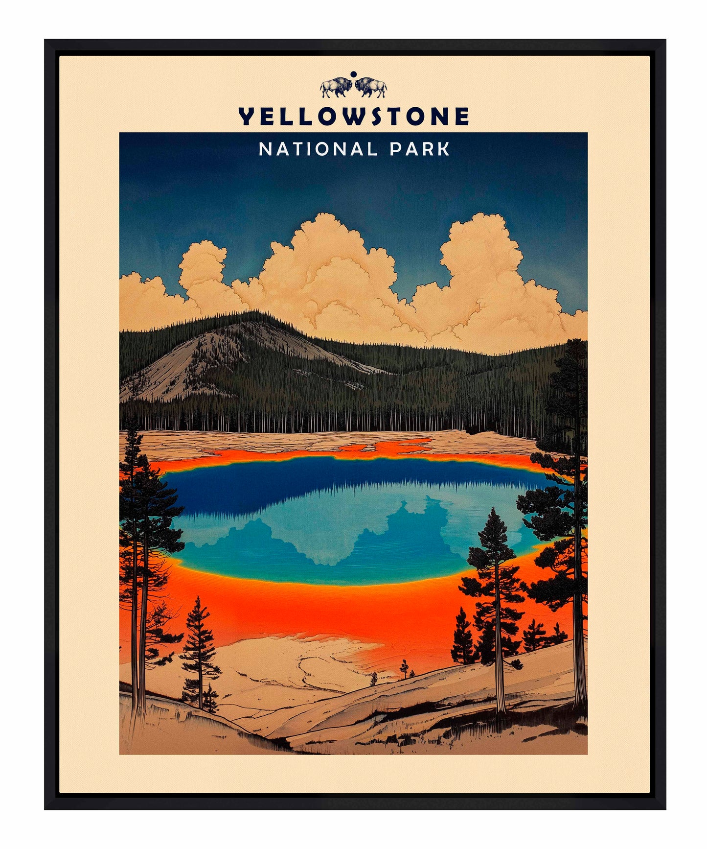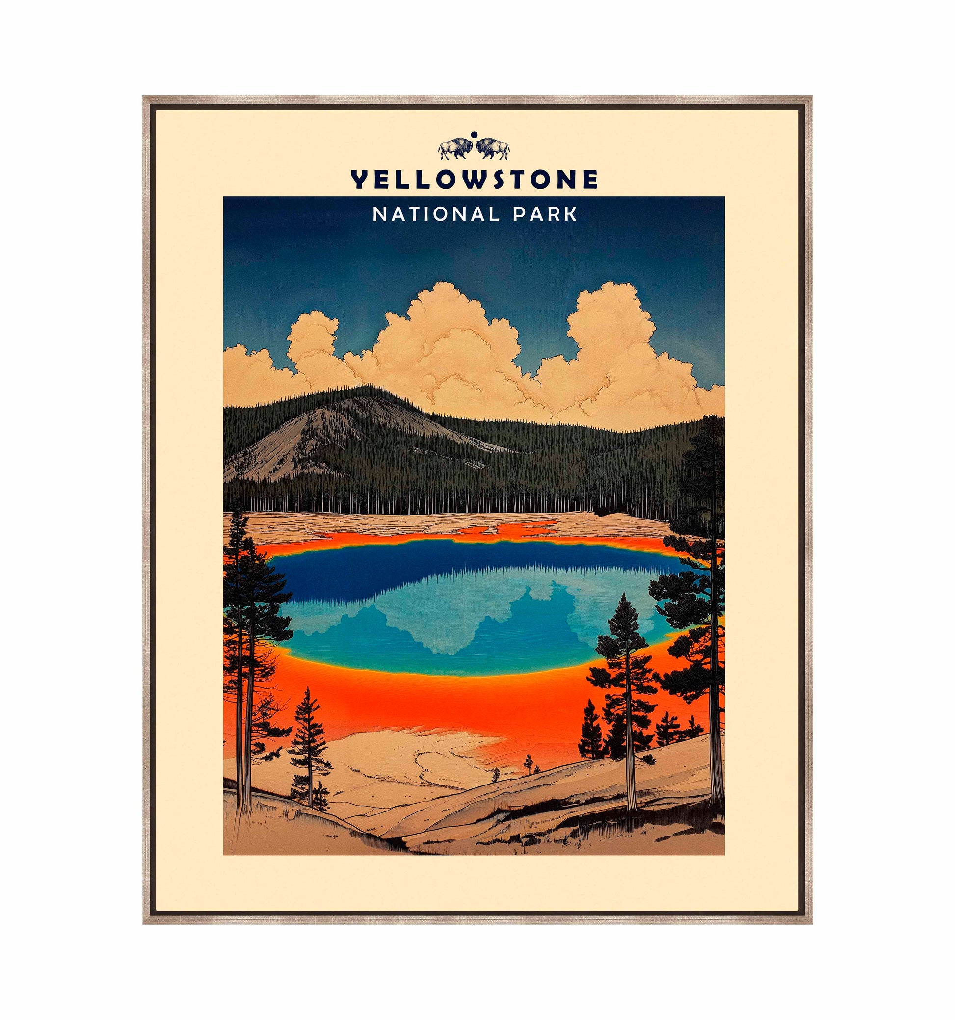 This vintage-style travel poster art depicts an iconic scene from Yellowstone National Park. The image showcases the vibrant, multicolored Grand Prismatic Spring, one of the park's most famous geothermal features. The spring's vivid blue center is surrounded by bands of orange, red, and yellow, accurately representing its real-life appearance. The composition is framed by silhouettes of pine trees, emphasizing the natural setting. Above the spring, billowing clouds dominate a deep blue sky, creating a dramatic backdrop. The mountainous terrain in the background adds depth to the scene. The artwork employs a limited color palette and simplified shapes, characteristic of mid-20th century travel poster aesthetics.