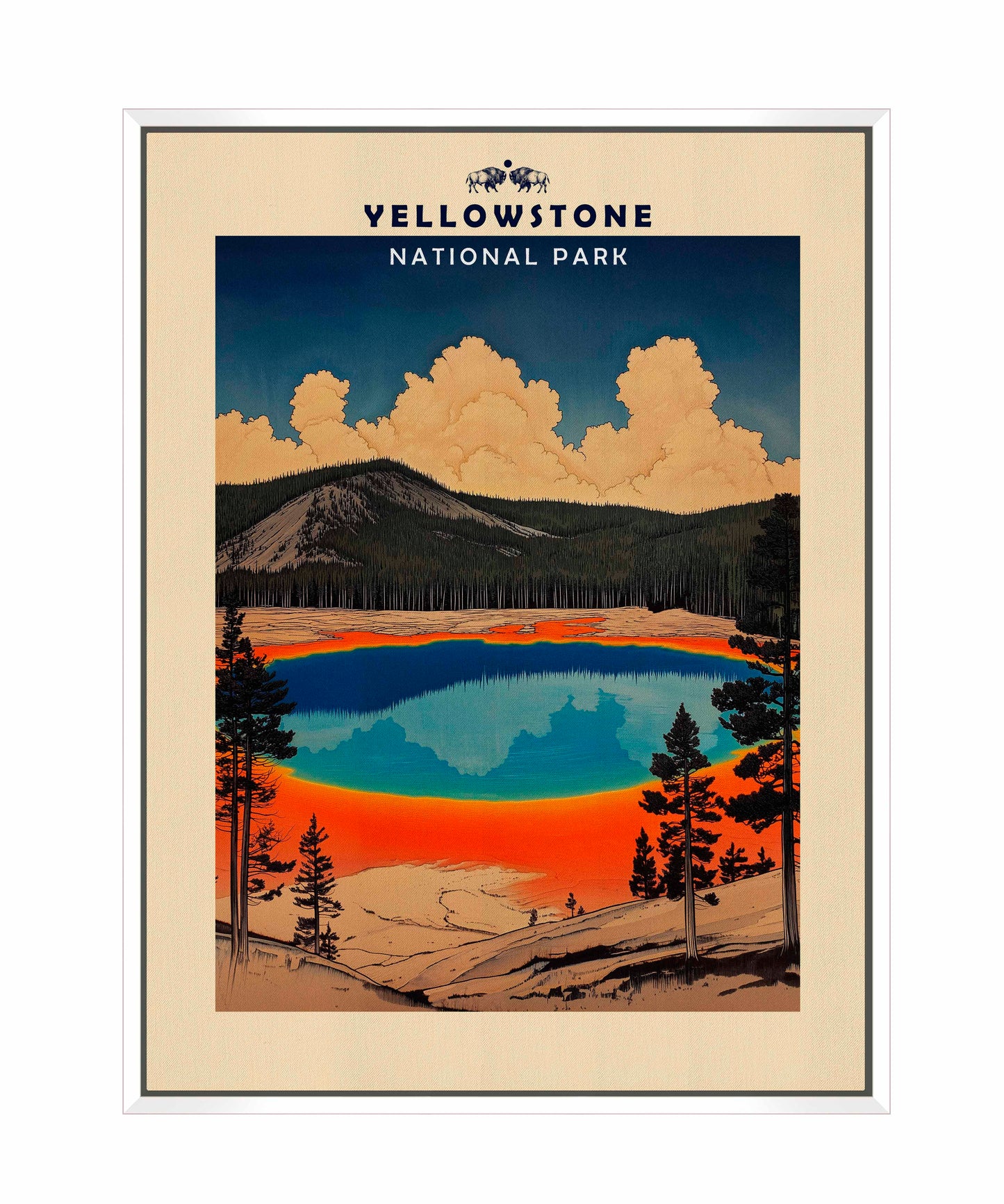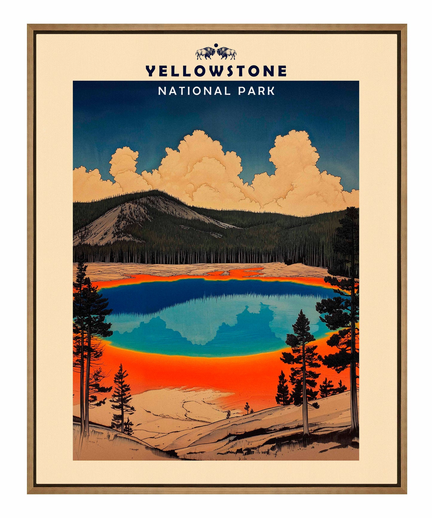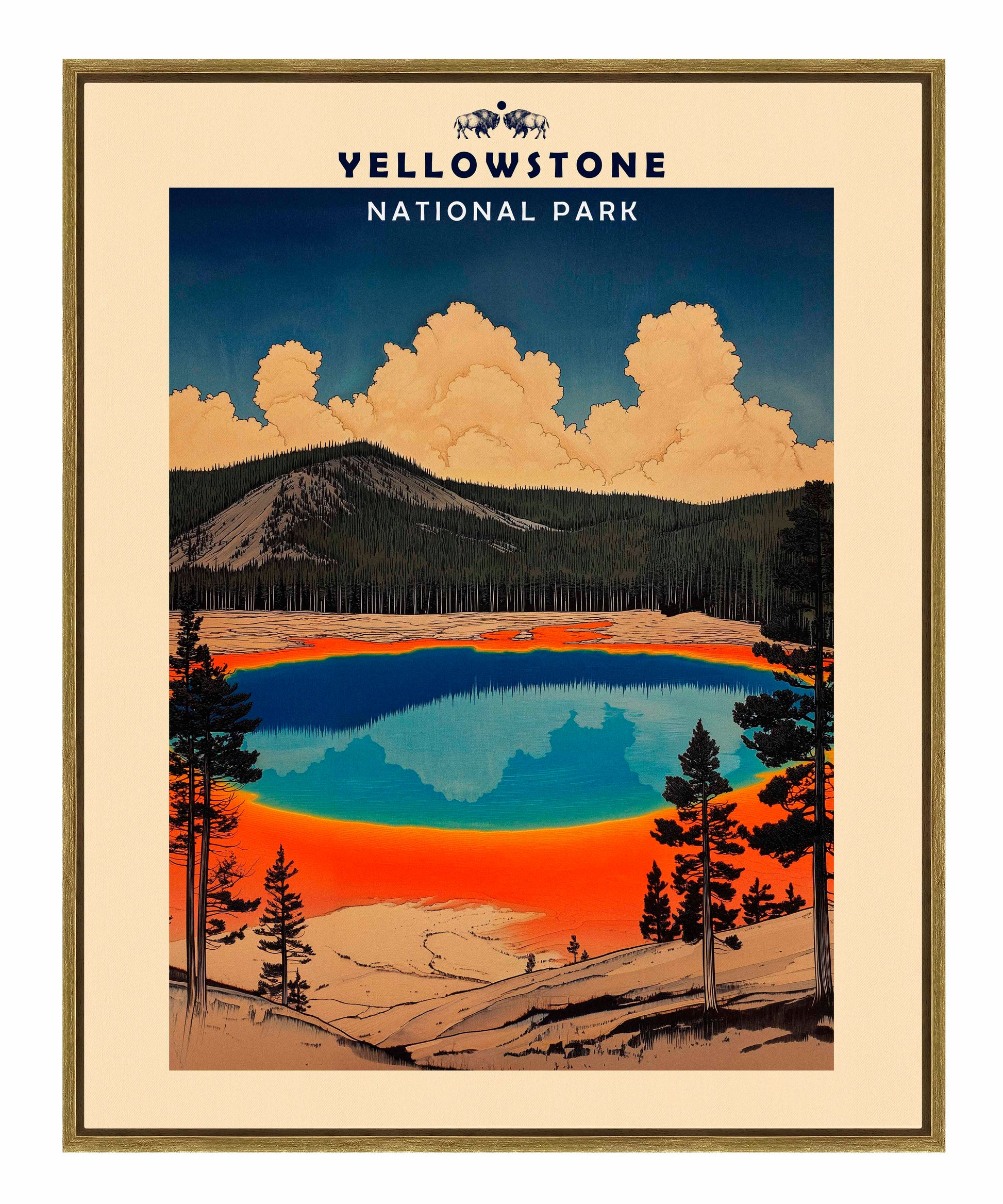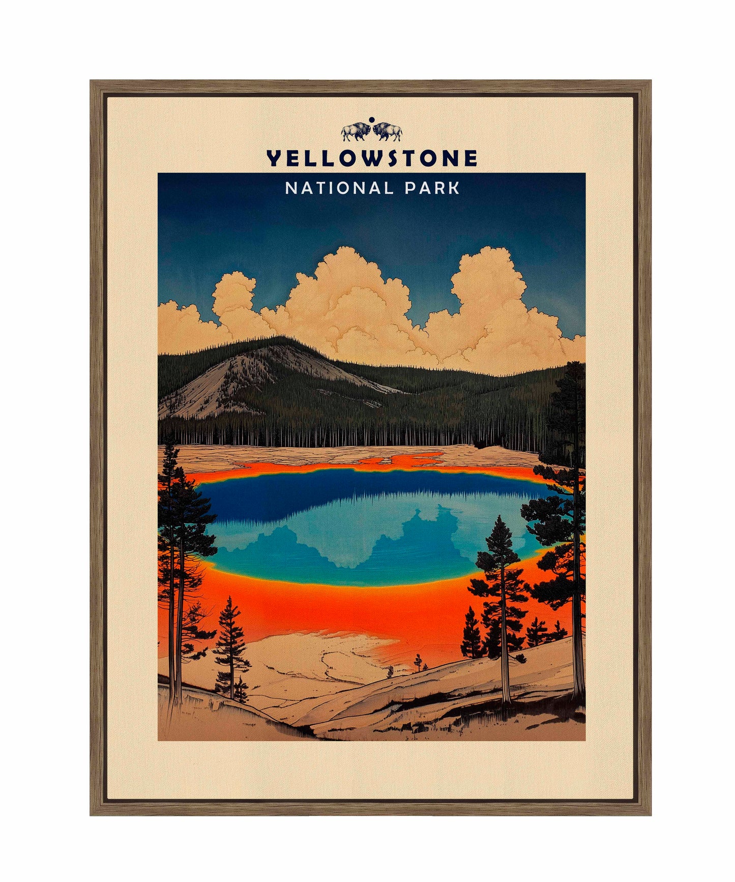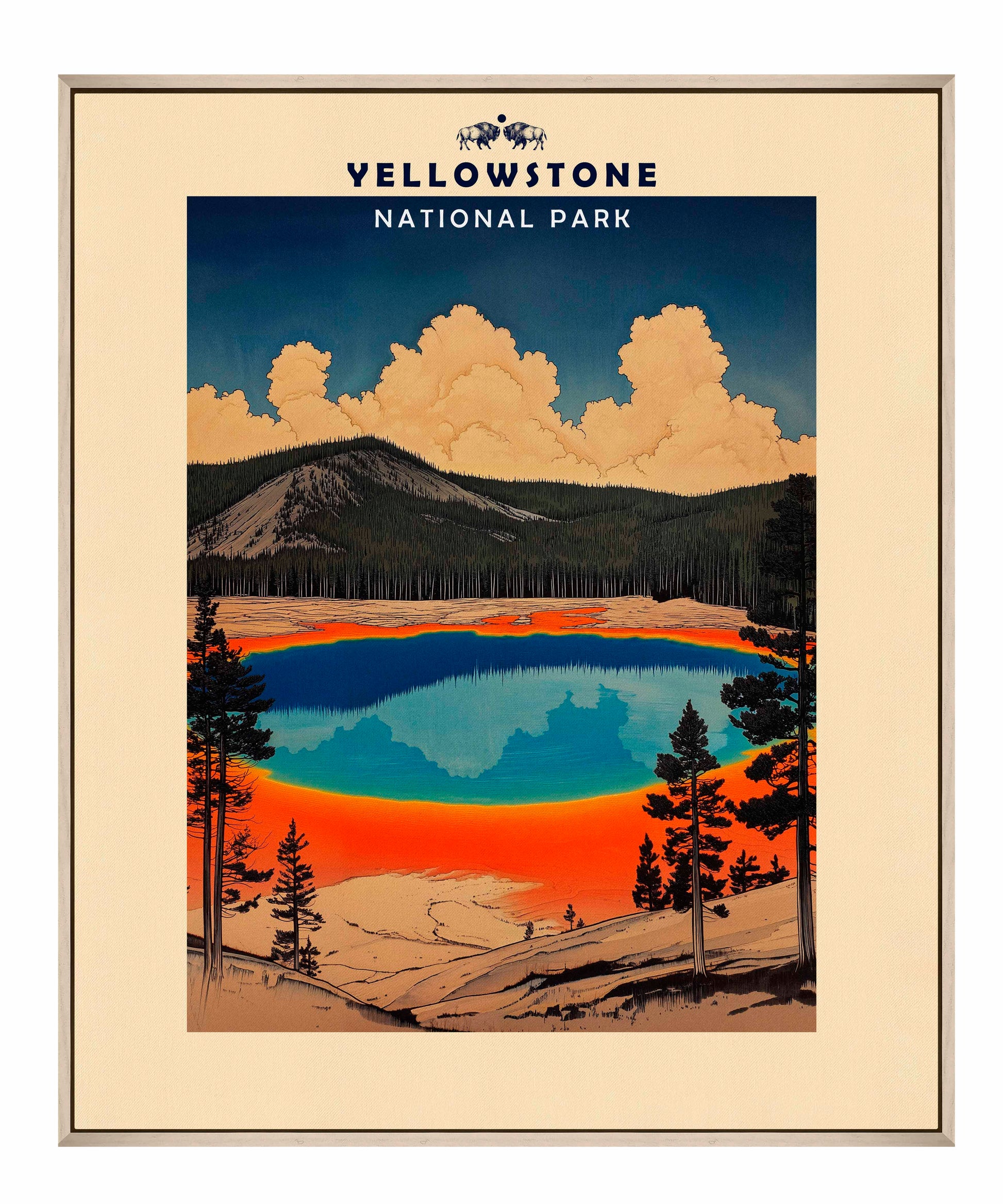 This vintage-style travel poster art depicts an iconic scene from Yellowstone National Park. The image showcases the vibrant, multicolored Grand Prismatic Spring, one of the park's most famous geothermal features. The spring's vivid blue center is surrounded by bands of orange, red, and yellow, accurately representing its real-life appearance. The composition is framed by silhouettes of pine trees, emphasizing the natural setting. Above the spring, billowing clouds dominate a deep blue sky, creating a dramatic backdrop. The mountainous terrain in the background adds depth to the scene. The artwork employs a limited color palette and simplified shapes, characteristic of mid-20th century travel poster aesthetics.