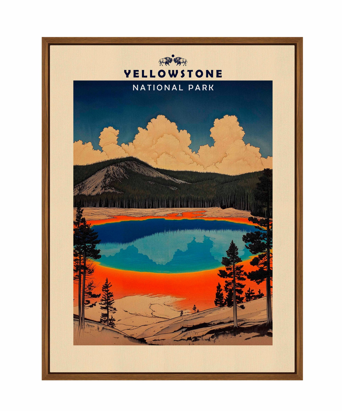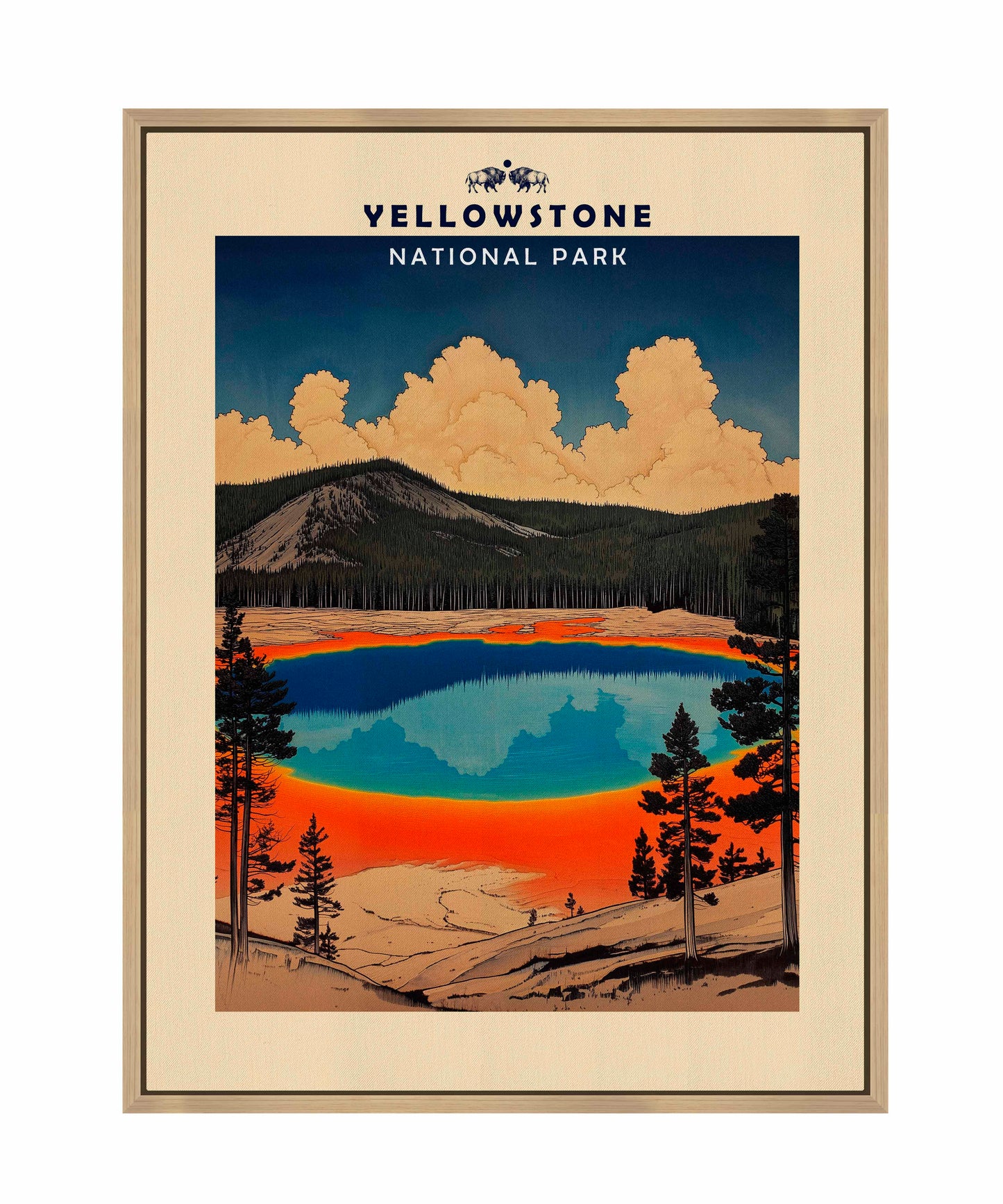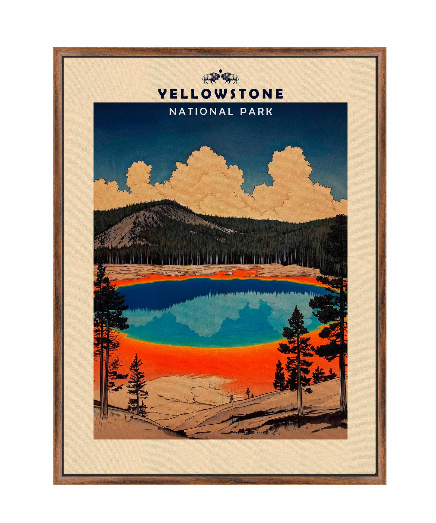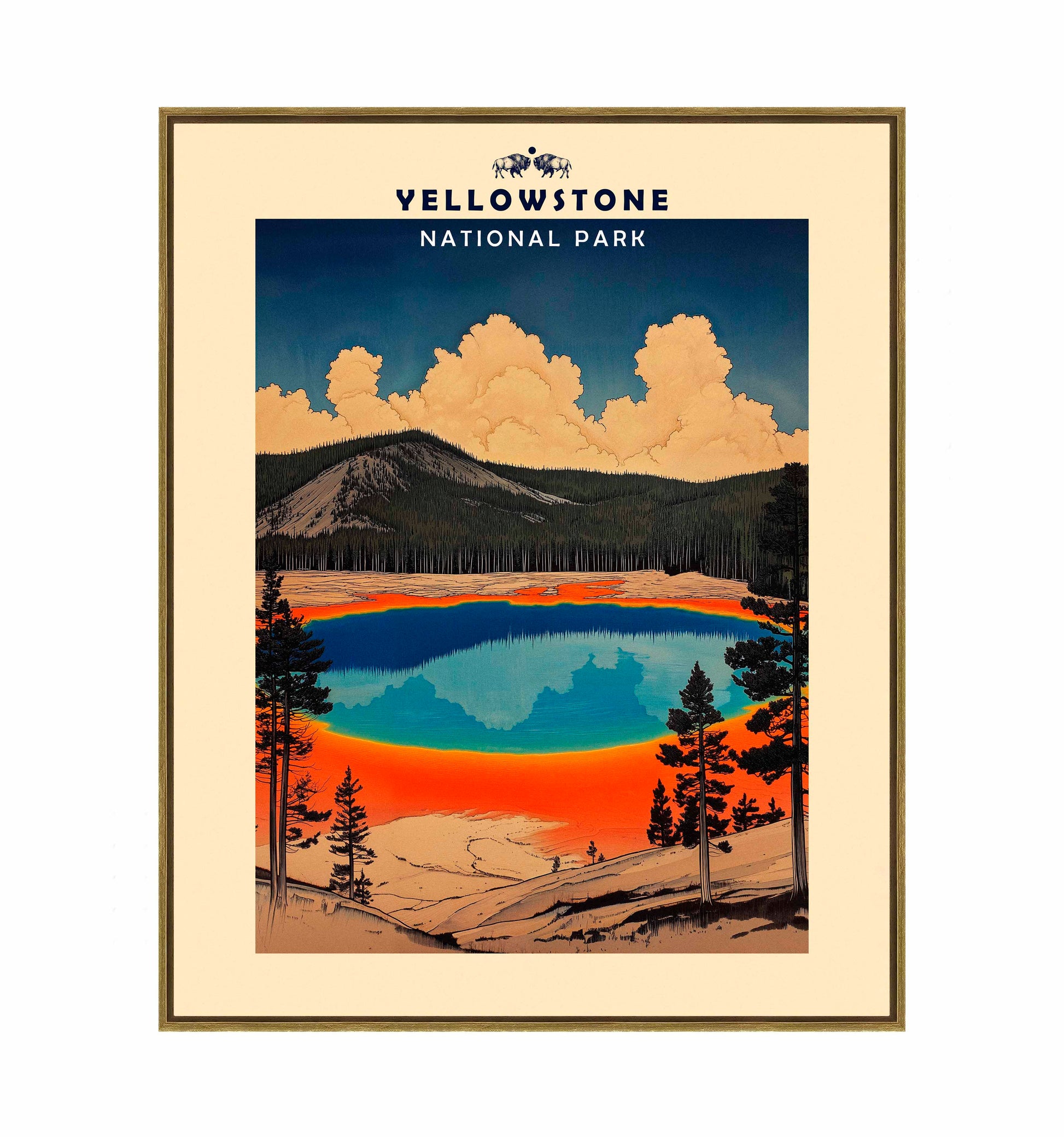 This vintage-style travel poster art depicts an iconic scene from Yellowstone National Park. The image showcases the vibrant, multicolored Grand Prismatic Spring, one of the park's most famous geothermal features. The spring's vivid blue center is surrounded by bands of orange, red, and yellow, accurately representing its real-life appearance. The composition is framed by silhouettes of pine trees, emphasizing the natural setting. Above the spring, billowing clouds dominate a deep blue sky, creating a dramatic backdrop. The mountainous terrain in the background adds depth to the scene. The artwork employs a limited color palette and simplified shapes, characteristic of mid-20th century travel poster aesthetics.