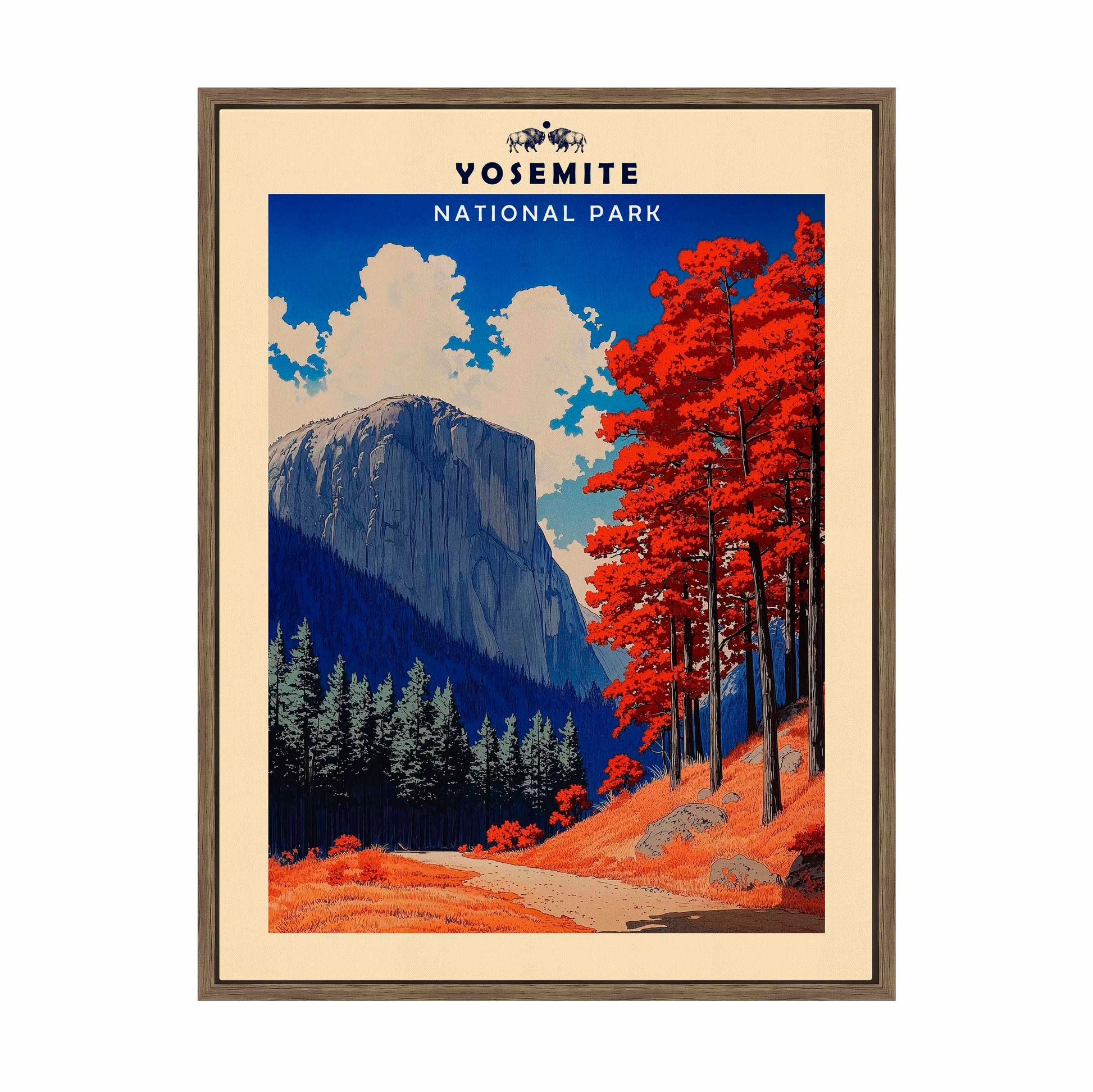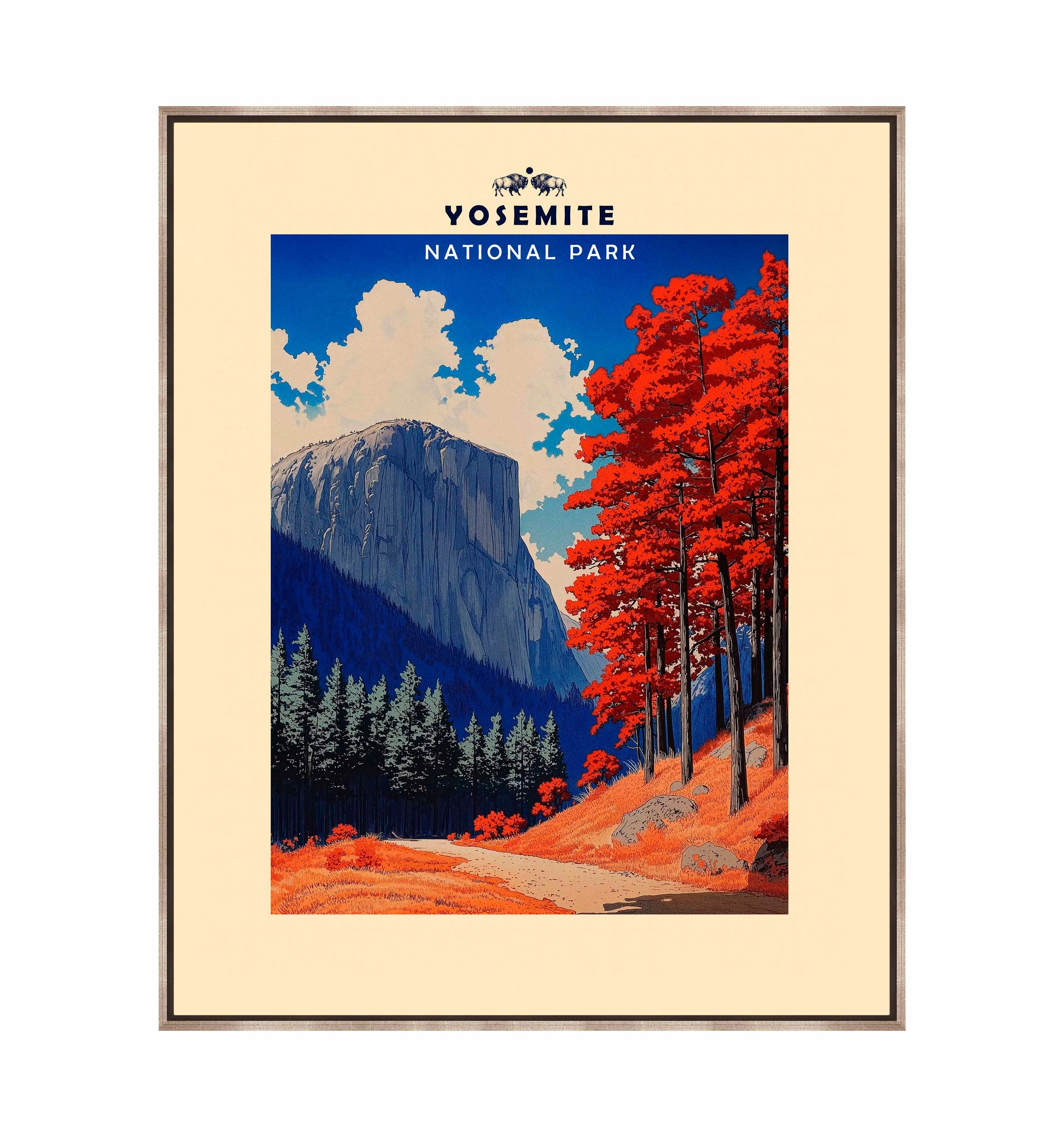 This vintage-style poster art of Yosemite National Park dramatically showcases one of America's most iconic landscapes. The composition is dominated by the majestic profile of El Capitan, its sheer granite face rising impressively against a bright blue sky dotted with billowing white clouds. In stunning contrast to the cool blues and grays of the rocky monolith, the foreground explodes with warm autumnal colors - vibrant red trees and orange-hued ground cover create a fiery frame for the scene. A winding path in the lower right invites the viewer to imagine venturing into this awe-inspiring vista. The artwork's bold use of complementary colors - the vivid reds against the deep blues - is characteristic of mid-20th century travel poster aesthetics and effectively captures the park's diverse beauty through the seasons. This striking design powerfully conveys Yosemite's grandeur, from its towering cliffs to its lush valleys, enticing viewers to experience the park's natural wonders firsthand.